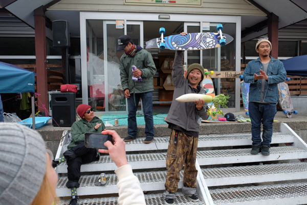 Sunday was tail-grab time. “Another grab that is an art form done well, but not done well often enough…” The comp started and that reach to the tail was proving elusive to many – is the tail grab the most neglected of snowboarding styles? The MC was calling out ‘tindy’s and tail fishes. Local Capita hero, Noboro Konno tweaked his way to the tongue-in-cheek “World Tailgrab Champion” title. Keeping it both surfy and rural, Hakuba local style, Noboru Konno took home a Lib longboard… and a giant ‘daikon’ Japanese radish!